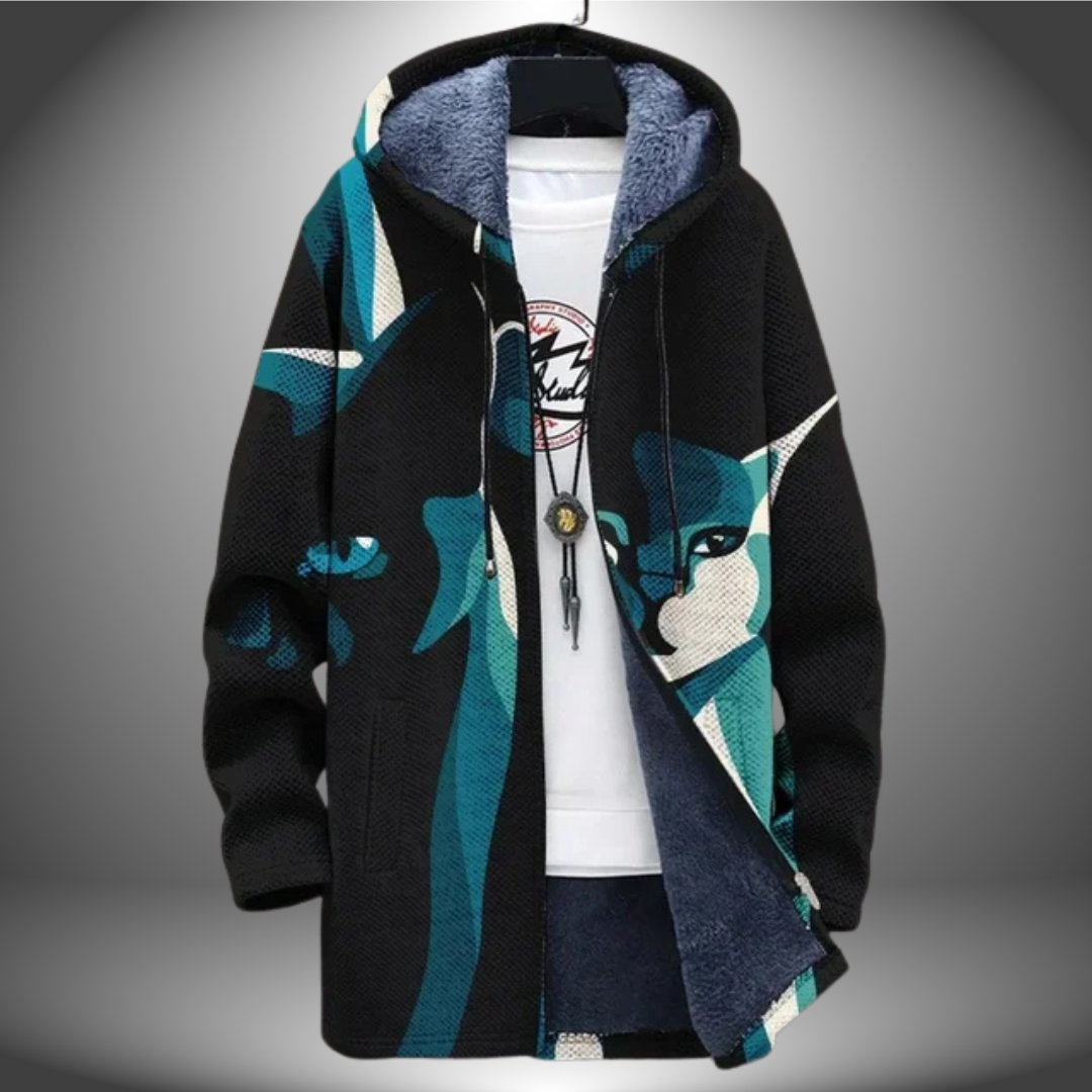 Ajoutez une touche unique à votre garde-robe d'hiver avec notre manteau long, entièrement imprimé d'un motif de chat abstrait. Cette veste en peluche épaisse à capuche offre un confort et une chaleur ultimes, parfaits pour les mois froids.